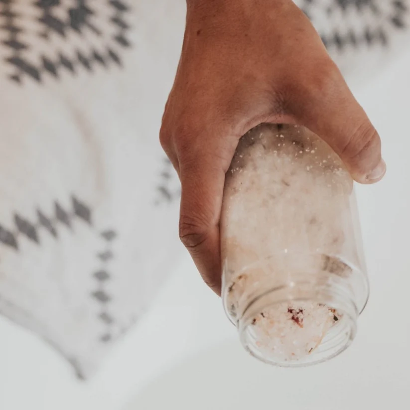 - Allow the salts to dissolve and the botanicals to float on top of the water