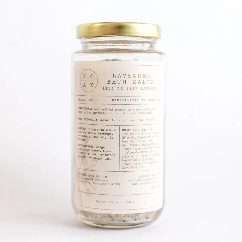Proudly Made in Canada, SOAK Bath Co is also a woman-owned brand based in Manitoba, Canada. All of their products, like the Lavender Bath Salts, are handmade by a local team of women in their Canadian studio with all-natural ingredients. At SOAK Bath Co they make bath and body products that are kind to the planet as well as your skin. Every bath salt is vegan as well as gluten, cruelty, paraben, phosphate and sulfate free.